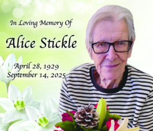 Mrs. Alice Stickle passed away peacefully at the Medicine Hat Regional Hospital on Sunday, September 14, 2025, at the age of 96 years. Alice Anhorn was born April 28, 1929, on the family homestead south of Hatton, Saskatchewan. She was the seventh baby born to Emmanuel and Katherina Anhorn.